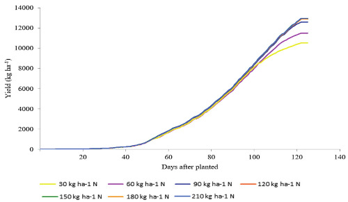 The simulation showed that from 90 kg ha-1 of nitrogen fertilization, the yields exceed 7 t ha-1. The highest yield is the one corresponding to the 150 kg ha-1 dose.