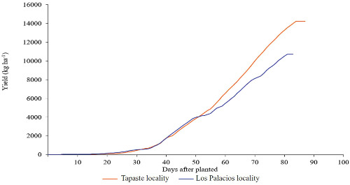 Regarding the study of the yield performance in different edaphoclimatic conditions, in the localities Los Palacios, in Pinar del Río, and Tapaste, in Mayabeque, the simulated yields were 4694 kg ha-1 and 7945 kg ha-1, respectively. Higher yields were evidenced in Tapaste locality, which must be conditioned by the performance of edaphoclimatic conditions (figure 4).