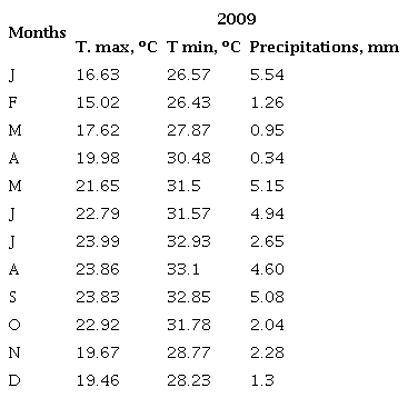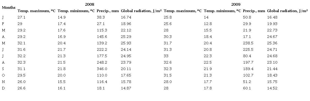 For the preparation of the climate file, the values of the meteorological variables (maximum and minimum temperatures, daily rainfalls and global radiation), corresponding to the months in which the experiments were carried out, were used. These data were obtained from Tapaste meteorological station, a few meters from the experimental area (table 2).