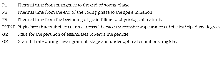 The crop simulation models based on physiological processes have been developed to assess the impact of climate change on food production and climate adaptation, as well as to develop strategies in the agricultural framework (Tatsumi 2016). These models represent, in a simple and synthetic way, the most important physiological and ecological processes that govern growth through the use of mathematical equations (Guevara 2007, Gouache et al. 2015, Dias et al. 2016 and Rodríguez et al. 2018).