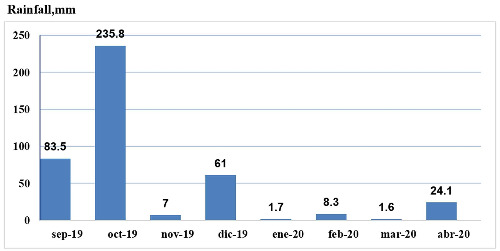 Figure 1 shows the rainfalls during the period September/2019-April/2020. Abundant rainfalls characterized September and October 2019. However, in the period from December 2019 to April 2020 they were very low in December, January, February, March and April. In this interval, important phenological stages of the crop occurred, which coincided with a very low level of rainfalls.