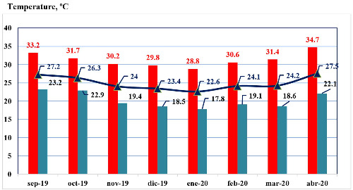 As shown in figure 2, the highest average temperatures in the experimental period occurred in September 2019 and April 2020, months in which the sown and cut of the experiment was made. The maximum temperatures reached their highest values also in these intervals, while the minimum temperatures were recorded in December 2019 and January 2020.