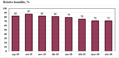 Figure 3 shows that the highest value of relative humidity was registered in October 2019, while the lowest was in April 2020. In the latter, the experiment cut was made.
