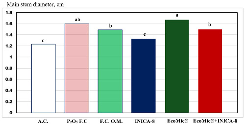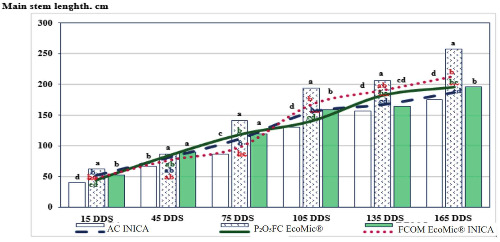 At 105 DAS, P2O5FC (193.90 cm) showed higher values (P <0.001) than the rest of the treatments, while EcoMic® + INICA-8 (167.10 cm) and FCOM (158.50 cm), although they shared common letters with INICA-8 (154.60 cm), were higher to EcoMic® (140.30 cm) and AC (130.60 cm) (figure 4).