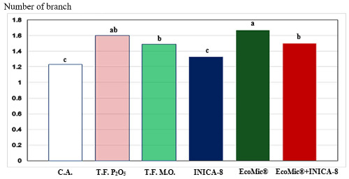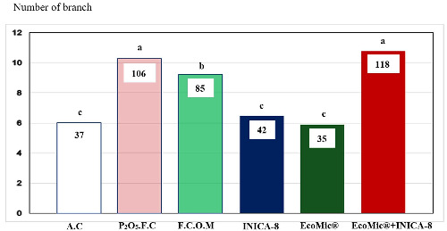 Various authors refer to results similar to that of this experiment, although with other beneficial microorganisms. Nithya et al. (2011) reported that in a study with mulberry, when inoculating the plants with a solubilizing phosphate bacteria and the beneficial fungus Aspergillus spp., the stem length was increased, as well as the number of branches and leaves. Abdel-Rahman et al. (2011) found that the effect of the co-inoculation of G. irradicans and Bacillus subtilis increased the height and number of branches of three varieties of basil, which surpassed the treatments where only each microorganism was inoculated.
