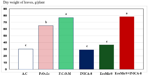 Figure 8 shows that both EcoMic® + INICA-8 (78.51g/plant) and FCOM (76.79 g/plant) were significantly higher to the rest of the treatments (P <0.001) and statistically similar to each other. The P2O5FC (64.97 g/plant) was higher to EcoMic® (36.60 g/plant), the absolute control (30.10 g /plant) and INICA-8 (29.02 g/plant).