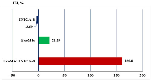 Figure 9 shows that the IEI that predominated in this variable was the one obtained in the combined inoculation of EcoMic® + INICA-8 (160.8 %), while the inoculation with EcoMic® was lower, but with positive values (21.98 %). Also, the simple application of INICA-8 was not efficient.