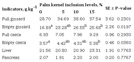 It is concluded that the inclusion of palm kernel meal in diets for broilers increased the weight of gizzard and empty caeca, which is related to mechanical and fermentative digestion, for the best use of the fibrous fraction by the animal.