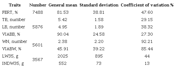 From the controlled variables, others were calculated, such as fertility (FERT), all or nothing character (FERT = 0 when mating was not effective and FERT = 1 when the breeder became pregnant and gave birth), viability at born (VIABB = DA/TB*100) and at weaning (VIABW = WN/DA*100). With the litters weight (LW35) the individual weight at 35 d (INDW35) was determined using the formula INDW35 = (LW35/WN).