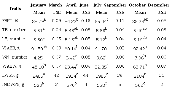Statistical analysis. The trimester and year factors were determined to characterize the reproductive performance of this Creole breed on all the traits to be studied (FERT, TB, LB, VIABB, WN, VIABW, LW35 and INDW35). The statistical package SAS (Statistical Analysis System) version 9.3 (2013) was used for this. Using the PROC MEANS, the statistics were determined: general mean, coefficient of variation (CV) and standard deviation (SD), to know the performance of these characters.