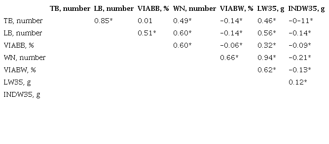 To find the phenotypic correlations (Pearson correlations) between the reproductive traits TB, LB, VIABB, WN, VIABW, LW35 and INDW35, the database with information from the weaned litters (3,567 observations) and the PROC CORR, also from the SAS was used.
