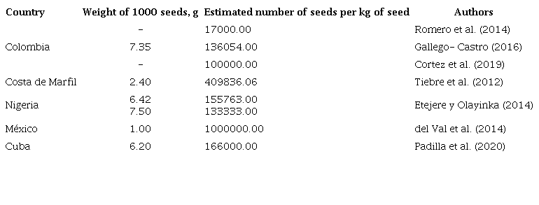 The estimates of the number of seedlings per kg of seeds reported show a higher variability with minimum values of 17 000 seedlings determined in Colombia up to one million seedlings per kg of seed obtained in Mexico.
