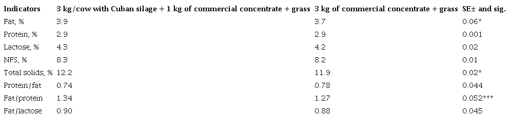 According to table 3, the difference in most of milk components was not significant. However, fat and the fat:protein relation differed between treatments, in favor of the animals that consumed Cuban silage. This could be influenced by the contributions of acetic acid contained in the silage, as well as total solids, which showed higher figures in the animals that ingested Cuban silage.