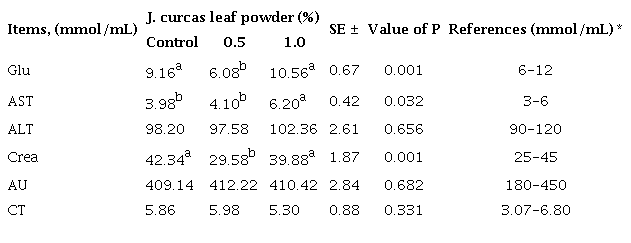 Biochemical parameters have always been used as health indicators in humans and animals. Studies of the influence of medicinal plants and their secondary metabolites on some indicators of blood biochemistry in laying quails are scarce. However, in laying poultry, it has been demonstrated that small concentrations of phytobiotics reduce serum glucose concentration, due to the astringent effect of these metabolites, which causes a slow intestinal release and maintenance of dietary glucose. In addition, there is a reduction of glucose in the animals, which can reduce blood circulation of harmful lipids (Martínez et al. 2012). This result shows that whole powder (0.5 %) of J. curcas leaves and some secondary metabolites could have a hypoglycemic effect on laying quails.