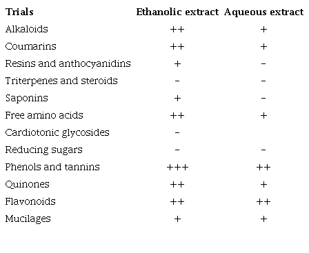 Results of the phytochemical screening of Jatropha curcas leaf extracts are shown in table 2. The presence of alkaloids, coumarins, resins and anthocyanidins, saponins, free amino acids, tannins, quinones, flavonoids and mucilages is highlighted, metabolites responsible for different biological activities, when used in small concentrations in diets (Más et al. 2017).