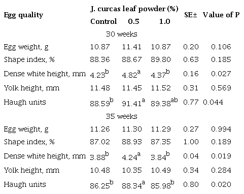 Table 4 shows the external and internal quality of the egg of laying quails, when 0.5 and 1 % of J. curcas leaf powder were added to the diet. In both sampled weeks (30 and 35), the inclusion of 0.5 % of J. curcas leaf powder increased (P <0.05) the height of the dense white and Haugh unit with respect to the remaining treatments, although in the week 30, Haugh unit was not statistically different in the groups with medicinal powder. There was no difference of egg weight, shape index and yolk height (P> 0.05) due to the effect of the experimental treatments.
