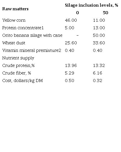 Elaboration of silage. Waste taro tubers and panela cane from two days post-harvest were used. The taro tubers and the panela cane were collected on the lands from Caicedo Agricultural Farm. Later, they were washed with drinking water for human consumption, drained for 10 min. and they were ground fresh with a mixed mill, with blades and a 2.0 cm sieve. For the formulation of the silage, chopped taro tubers (50 %), chopped cane (22 %), molasses (2 %), wheat dust (20 %), vitaminized pecutrin (0.5 %), calcium carbonate (0.5 %) and natural yogurt (5 %) were combined. Subsequently, a homogeneous mixture with all the ingredients was carried out on a flat concrete floor, covered with plastic, at room temperature. A part of this mixture was placed in plastic microsilos, with a capacity for 1 kg, and it was evaluated at 1, 4, 8, 15 and 30 d to carry out the respective laboratory analyzes. The mixture was deposited in dark plastic bags until the moment of use.