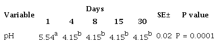 In the evaluation of the pH there were differences (P <0.0001) during the study days. The highest pH value was found on day one and between 4 and 30 days it was stable (table 2).