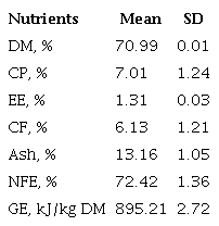 Determination of chemical components in silage. The determination of the chemical components of the silage was carried out on day 8 of fermentation, in accordance with recommendations for this type of food (Caicedo et al. 2020). Dry matter (DM), crude proteins (CP), ether extract (EE), crude fiber (CF), ash and nitrogen-free extracts (NFE) were verified, according to the AOAC (2005). The calculation of gross energy (GE) was carried out according to Ewan (1989).
