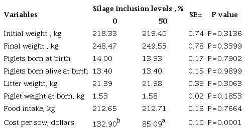 The sows that intake silage showed lower feeding cost. The feeding costs are the most important and their magnitude shows the level of profits for the farm (Estévez 2016, Bauza et al. 2018 and Sánchez et al. 2018). In this regard, Magaña et al. (2002) point out that the relative costs of sow feeding represent 15.1 % in full cycle farms.