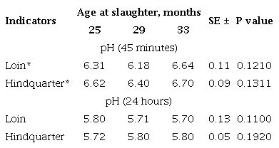 Table 1 shows mean pH values, recorded at 45 min. and at 24 h postmortem in the two analyzed muscles. No difference was found (p> 0.05) among evaluated ages. This result was similar to values described for loin samples (table 2). According to Pérez-Linares et al. (2015), pH at 24 h agreed with the acceptable ranges of rigor mortis, as a quality indicator for beef.