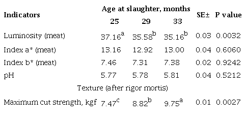 Regarding meat toughness, a difference (p <0.01) was found among groups. It was determined that the values of resistance to cut strength increased with age by 18 % and 30 %, with respect to the younger group.