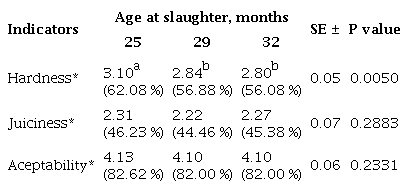 Differences (p <0.01) were found among the opinions of untrained panelists, only for the sensory indicator of hardness. The other indicators did not differ. Subjective opinions of consumers, regarding juiciness and acceptability of meat, were very homogeneous. However, it was very interesting that there was a higher percentage of panelists who identified a meat of less toughness in the group of animals slaughtered at a younger age (table 3).