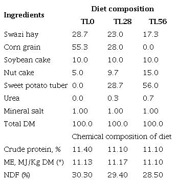 There was no rejection of the rations and the animals did not show clinical symptoms of ruminal disorders. This allows inferring that higher intake levels can be obtained from this tuber. Backer et al. (1980) achieved an ad libitum intake of 2.41 kg DM (tuber-urea) 100 kg of live weight-1 d-1.