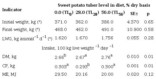 Productive and economic variables were evaluated: live weight gain (LWG), intakes of DM (DMI), CP (CPI), metabolizable energy (MEI), food conversion (FC), CP (CPC), ME (MEC) and feeding cost (FC). To determine the FC, the production cost of the chopped fresh tuber was estimated. Local market prices were used for the other ingredients in the ration. The production cost of the FSPT was obtained from the records of expenses, agronomic biomass yield and useful material offered to the animal.