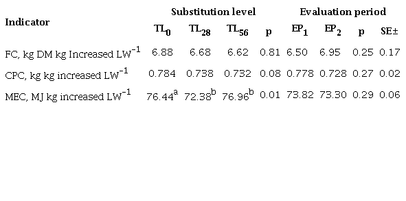 The CPI (table 2) was not affected by TL * EP and EP (P> 0.05). On the other hand, the TL28 showed lower intake than the other two treatments (P <0.001). EP1 and EP2 had an average CPI of 0.301 and 0.296 kg, 100 kg of live weight-1 d-1, respectively. Of the total CP intake in TL28 and TL58, 6.3 and 19.3 was contributed by urea, levels that are low with respect to the recommended maximum (Barker 1970).