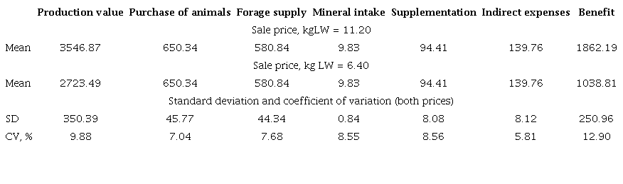 Table 1 shows the results of the cost sheets with the two prices. As expected, the benefits are higher when prices per kilogram of LW are higher. The highest variation in the production value is shown, although profits had the highest variation coefficient, if these variation is analyzed based on the mean.