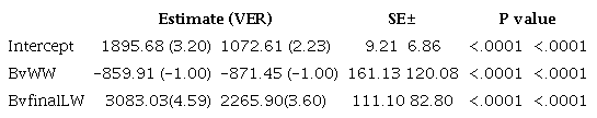 Table 2 shows the value of the estimates of the multiple partial regressions or VER, obtained from the benefits shown in the previous table and the BV for the weaning weight (BvWW) and the final weight, at 18 months of age (BvfinalLW). These values are accompanied by their standard errors and the probability of their significance, which are used as a guide to know about their precision; but, above all, to assess the relative importance of including them or not, in the selection indices, assigning relative importance of 1 to the lowest value and the others referred to this These values correspond to the VER used in the calculation of the standardized selection indices (Stind), which were used later (method 3).