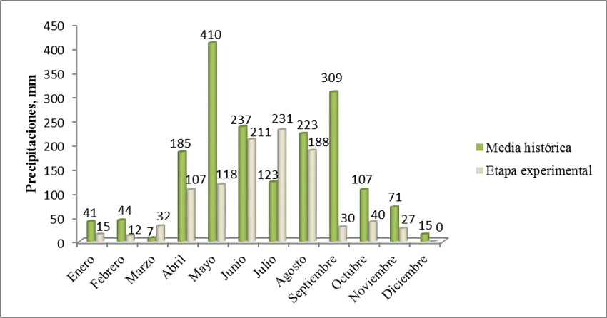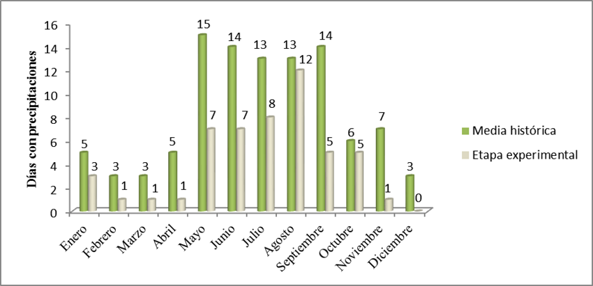 During the development of the experiment, the volume of rain fell considerably, as well as the number of rainy days with respect to the historical average (figures 1 and 2), which undeniably had an effect on the development of the plants.