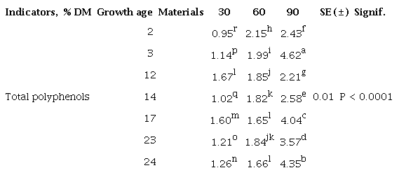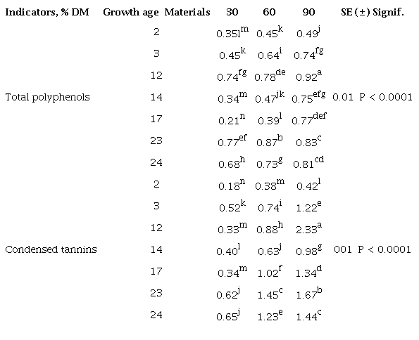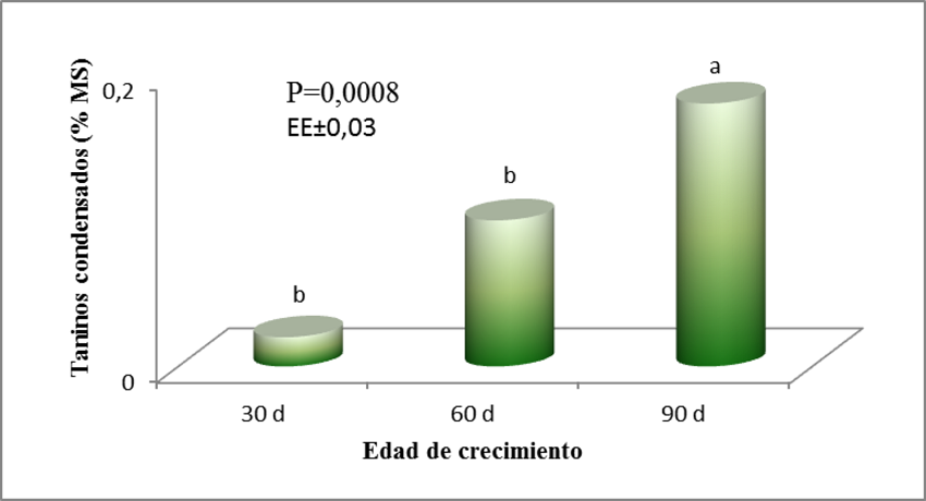 The content of total polyphenols in the dry season (table 1) showed interaction between the factors growth age (30, 60, 90 d) and T. diversifolia materials (2, 3, 12, 14, 17, 23, 24). However, in the total condensed tannins there were not interactions. The main effects are shown in figures 3 and 4.