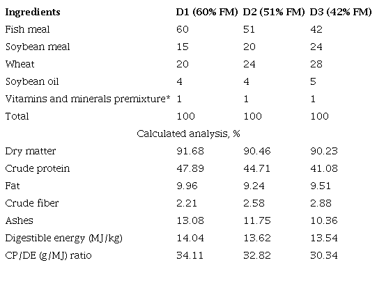Llanes et al. (2009) carried out a comparative study between the imported food and another of national production with 60 % fish meal, FM (47.89 % CP and 14.04 MJ/kg DE), with which they achieved better productive and economic results. This formulation is the one used today. The difficult economic situation that Cuba is going through and the low availability of FM in the market makes it necessary to reduce its inclusion percentage, without disfavoring the productive indicators.