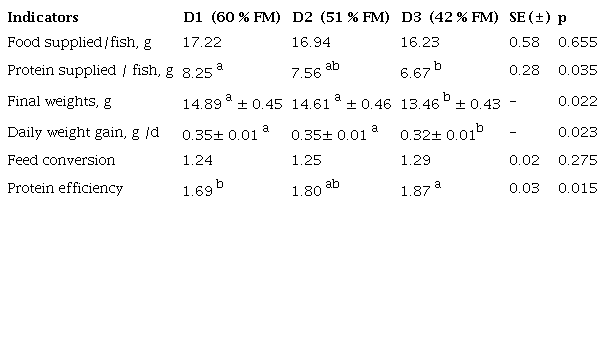 The productive performance of Clarias gariepinus small fish with the experimental diets (table 3) showed that the decrease in FM and, therefore, in dietary protein provided less supply of CP for the animals and a decrease of 1.43 g in the final weight of the fish that intake the D3 (42 % FM). Feed conversion was not disadvantaged between treatments. Similar results reported for the same species Matter et al. (2004), by achieving better growth, feed efficiency and carcass composition, with protein levels of 37 % compared to 32 and 28 %.