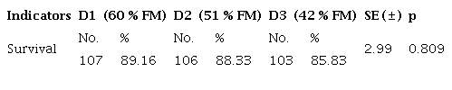 The results of the survival rates are shown in table 4. There were not differences between the diets. This indicates that there was no cannibalism, by reducing the concentration of CP. These results were higher than those achieved under productive conditions (40 %).