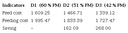 Economic analysis. It was carried out by Toledo et al. (2015) procedure. The costs of the rations were calculated from the international prices of raw materials for November 2021, reported by Indexmundi (2021) (table 2). The costs of the rations were calculated from the international prices of raw matters for November 2021, reported by Indexmundi (2021) (table 2). To the results was added 50 % of the total cost of raw matters for additional expenses (transportation, maquila and administrative) for Cuba. These values were multiplied by the FCF obtained in this study to know feeding costs.