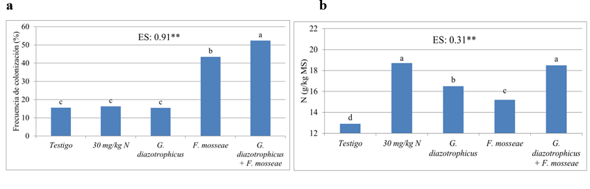 Regarding the concentrations of N in the biomass of the aerial part (figure 1 b), there was a similar effect to the biomass yields. That is: G. diazotrophicus as well as F. mosseae increased the values of this indicator. When comparing both treatments, the highest values corresponded to G. diazotrophicus. However, the joint application of biofertilizers produced significantly higher N concentrations than those obtained with the inoculation of one or the other separately, and similar to the treatment with nitrogenous fertilizer.