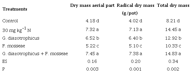 G. diazotrophicus as well as F. mosseae increased the dry mass yields of the aerial, radical and total part of the grass. Among these treatments, the highest values corresponded to G. diazotrophicus. However, with the co-inoculation with both biofertilizers, values significantly higher than those reached for each one separately, and similar to those obtained with nitrogen fertilization, were recorded (table 1).