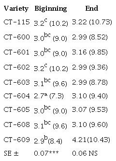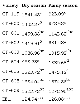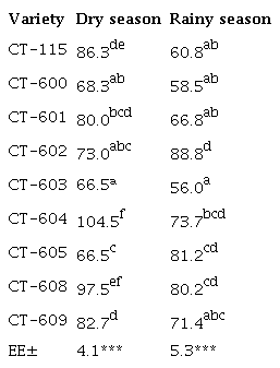 The plants height differs (P <0.001) between varieties in both climatic seasons and CT-603 showed the lower value in both seasonal periods. However, drew the attention that the height of varieties was numerically higher, in general, in the rainy season (table3).