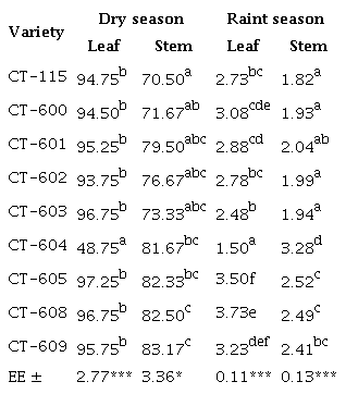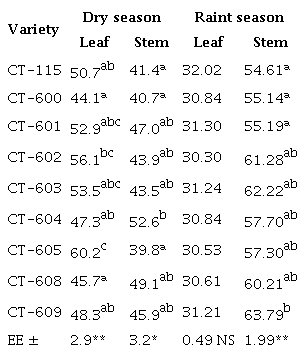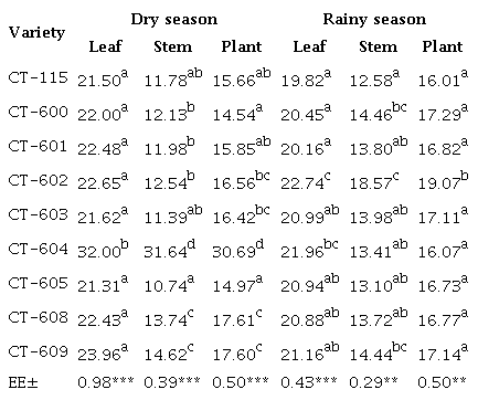There were differences (P <0.05) in the dry matter percentage of leaf, stem and the whole plant between the varieties in both seasonal periods and the highest value, in general, was recorded by CT-604 (table 4). It is of highlighted, that plants had lower dry matter content in the dry season.