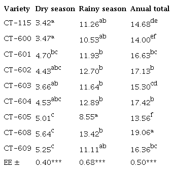 The dry matter yield in both seasonal periods and in the annual total differed (P<0.001) between varieties. In the dry season the higher values were reached by the varieties CT-605, CT-608 and CT-609 and the lower value was to CT-115. In the rainy season the lower value was to CT-605. In the annual total CT-608 reached the highest (P<0.001) yield with 19.06 t DM/ha (table 8).