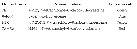 To carry out the separation by size of the fragments obtaining by PCR, they were submitted to electrophoresis in poliacrilamide gel in an automatic sequencer ABI Prism® 377 XL (Applied Biosystems), marking the ADN primers with fluorochrome of three different colors (blue, green and yellow), applying other fluorochrome of a fourth color (red) to mark an standard of sizes. In this way the gel yield was optimized since various microsatellites of same size and marked with three different fluorochromes can be loaded in a same bowl. The used fluorochromes are described in table 1.