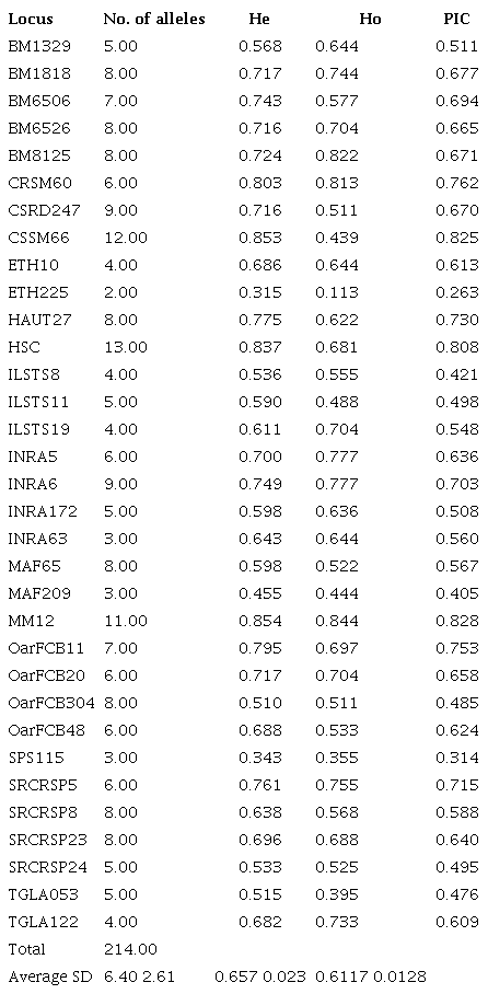 Another indicator of interest showed in table 2 is the Polymorphic Information Content, which is used to determine the informative quality of the marker. It can be see that, from the 33 markers used in this study, a total of 25 were very informative, and only 8 (ETH225, ILSTS008, ILSTS011, MAF209, OarFCB304, SPS115, SRCRSP24 and TGLA053) did not reached such designation due they do not reached the PIC value higher to 50 %, as the international scientific community requires to identify the markers with higher informative quality. The markers CSSM66, HSC and MM12 by having the PIC above 80 % can be considered as exceptionally informative for Landim breed.