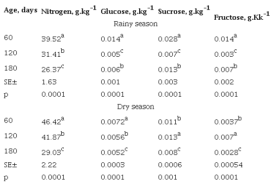 The contents of nitrogen, glucose, sucrose and fructose in T. diversifica decreased with the regrowth age in 13.15, 0.008, 0.015 and 0.007 g.kg-1 in the rainy season; while, for the dry season were of 17.39, 0.002, 0.003 and 0.0009 g.kg-1, respectively (table 1).