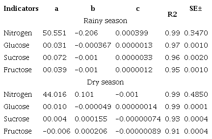 Quadratic equations were fitted for all the indicators. All the regression coefficients were higher to 0.95 for all metabolites in both seasonal periods except for sucrose and fructose during the dry season that was 0.93 and 0.91, respectively (table 2).