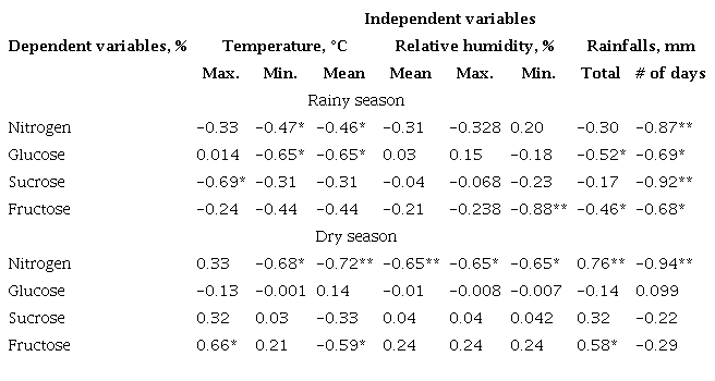 The correlations between sugars and nitrogen (primary compounds) with the climate factors were changeable (table 3). During the rainy season the higher coefficient (r) values were for sucrose with the rainy days and maximum temperature (-0.92 and -0.69, respectively); nitrogen with minimum, mean temperature and rainy days (-0.47, -0.46 and -0.87, respectively); glucose with minimum, mean temperature and rainy days (-0.65, -0.65 and -0.69, respectively) and fructose with the minimum relative humidity and rainy days (-0.88, -0.46 and -0.68, respectively) it is important to highlighted that the rainy days were related with all the indicators. In the dry season only the N correlated with the minimum and mean temperature, the mean, maximum, minimum relative humidity, total rainfalls and rainy days(-0.68, -0.72, -0.65, -0.65, 0.76 and -0.94, respectively) and fructose with mean, maximum temperature and total rainfalls (0.65, -0.59 and 0.58, respectively.
