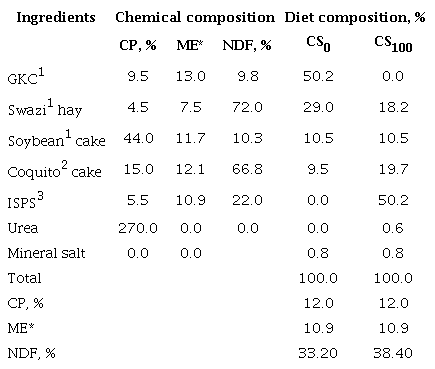 Through a completely random design and factorial arrangement 2 x 2 two substitution levels of the GKC by ISPS (CS), dry basis, in a fattening diet of male cattle: 0.0 and 100.0% (CS0 and CS100) and two evaluation periods (EP1 and EP2) were studied. The experimental diets were iso-protein and iso-energetic (table 1).