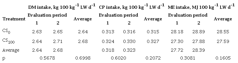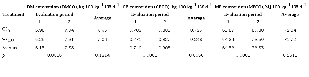 The interaction CS*EP was not significant for the DM conversions (p = 0.7328), CP (p = 0.4143) and ME (p = 0.1600). The conversion of DM (DMCO) and metabolizable energy (MECO) (table 4) were not affected by silage level and experimental period (table 4), with average of 6.85 kg and 72.01 MJ kg-1 of LW increase, respectively. In contrast, the CP has better conversion in the corn treatment (table 4), difference that could be related with the urea, although this one only contributed approximately 13.5 % of the ration CP, a very lower level to the maximum of 30.0 % recommended. With similar diets, Solís (2011) did not obtained effect of the ISPS level on these conversions, with average values of 6.18, 0.790 and 16.48 for DMCO, CPCO and MECO, respectively.